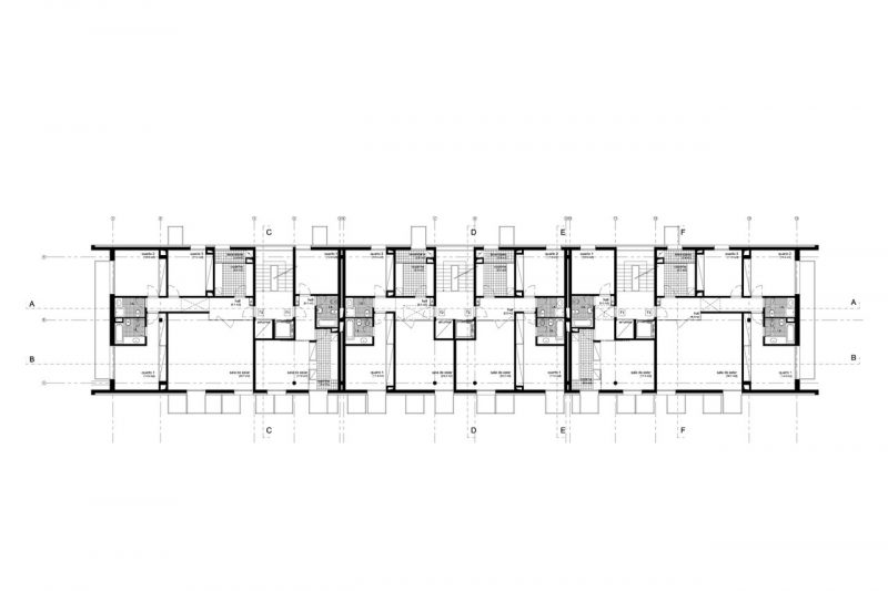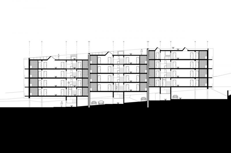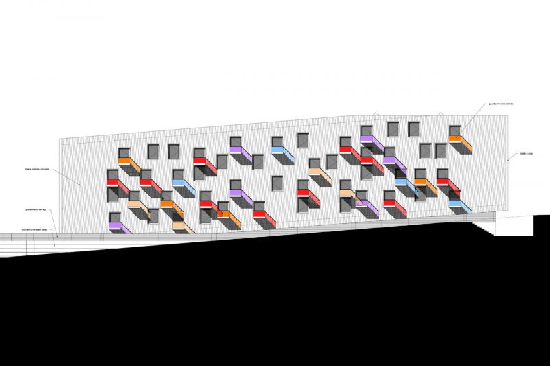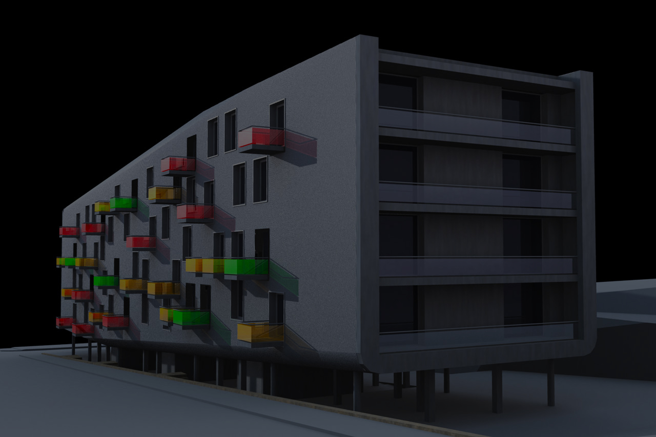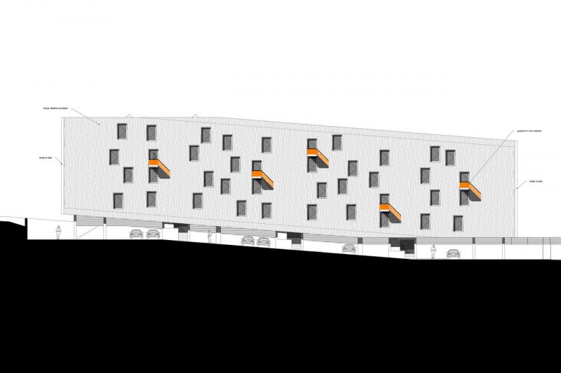 | O edifício das Pedreiras tem como tipologia a habitação plurifamiliar em espaço restrito de comdomínio fechado. É implantado de forma a acompanhar o declive natural do terreno. Levita sobre estacas de betão, o corpo cria um vazio, um espaço de chegada. Um bloco inclinado que se solta e transmite equilibrio sobre a via. A sua superficie exterior, ritmica e desordenada, esconde um nucleo com 4 pisos dividido em três blocos implantados a diferentes cotas. |